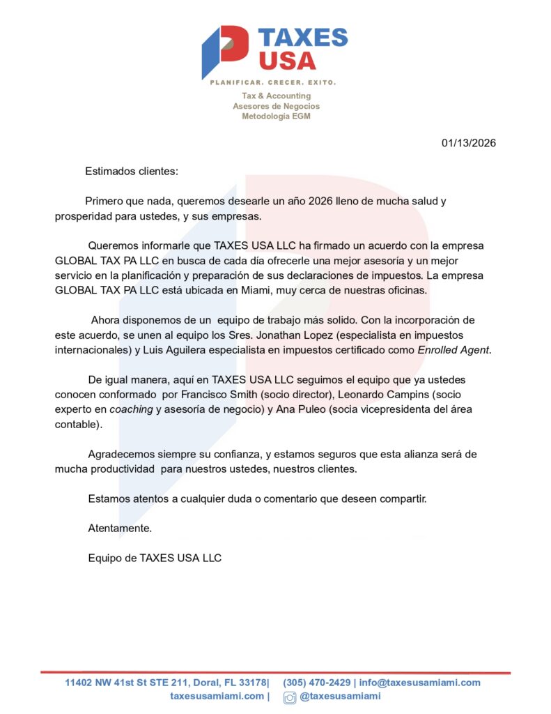 Home » Nuevo equipo de taxes de TAXES USA LLCNuevo equipo de taxes de TAXES USA LLCpor Tax USA Miamienero 16, 2026enero 16, 2026 Etiquetas:alianzascontabilidad pymesdeclaración de impuestosimpuestos